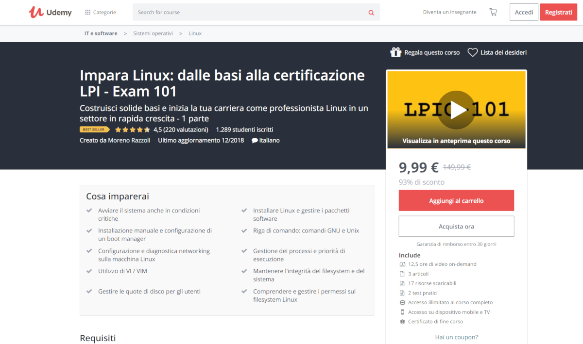 Per chi non la conoscesse, Udemy è una piattaforma per l’e-learning che ha organizzato diversi corsi per diventare esperti sul campo Linux, completamente in Italiano e certificato, al termine del quale potrete decidere se sottoporvi all’esame LPI e ottenere la relativa certificazione LPIC-1.