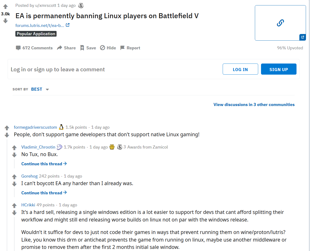 La discussione non si limita al solo Reddit: post simili sono emersi anche sui forum ufficiali di Battlefield e su Lutris. Chiaramente il numero di giocatori di Battlefield V che usano Linux è esiguo, ma questo non dovrebbe contare.