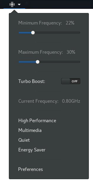 C’è un’estensione di GNOME Shell perfetta per voi. Si chiama CPU Power Manager e agisce con il driver intel_pstate. Intel_pstate è parte integrante del sottosistema CPU performance scaling all’interno del kernel Linux (CPUFreq). Riguarda i processori Intel a partire da Sandy Bridge in poi.