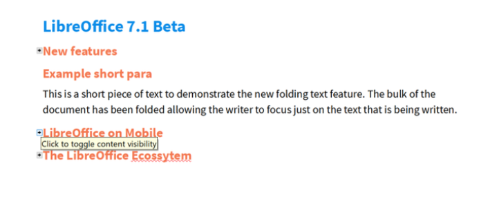 Le nuove funzionalità prevedono una nuova folding mode in Writer che consente di compattare il testo sotto un titolo in modo da vedere solo l’intestazione. Funzione molto utile per riordinare un documento in fase di stesura. La funzionalità è attualmente sperimentale, il che significa che deve essere attivata tramite un’opzione apposita e non è abilitata di default.