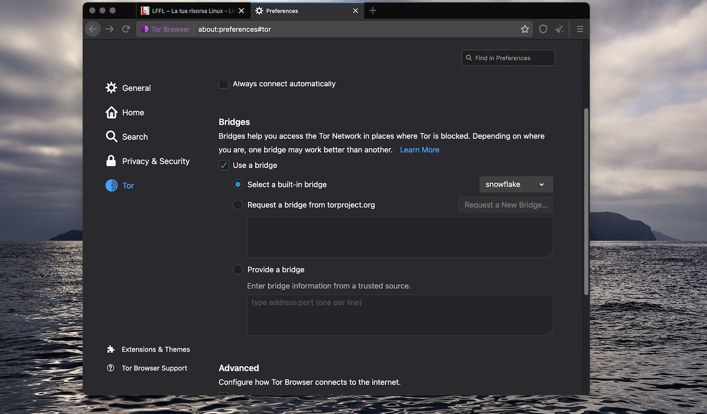 Per abilitare Snowflake come bridge per la connessione alla rete Tor dovete visitare la sezione Tor nelle Preferenze. Abilitate quindi l’opzione use a bridge, e poi Snowflake dall’opzione select a built-in bridge. Snowflake è disponibile per tutte le piattaforme supportate dal browser, incluso GNU/Linux, ovviamente.