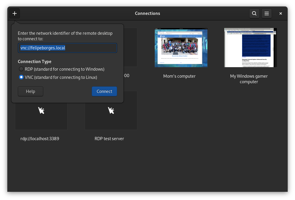 GNOME 41 lancia Connections, un nuovo client desktop che consente di connettersi e passare tra diverse sessioni remote contemporaneamente. Connections, che sostituisce l’analoga funzionalità presente in Boxes, offre un’esperienza moderna e intuitiva per la connessione ad altri desktop. Sono supportate sia le connessioni VNC che RDP.