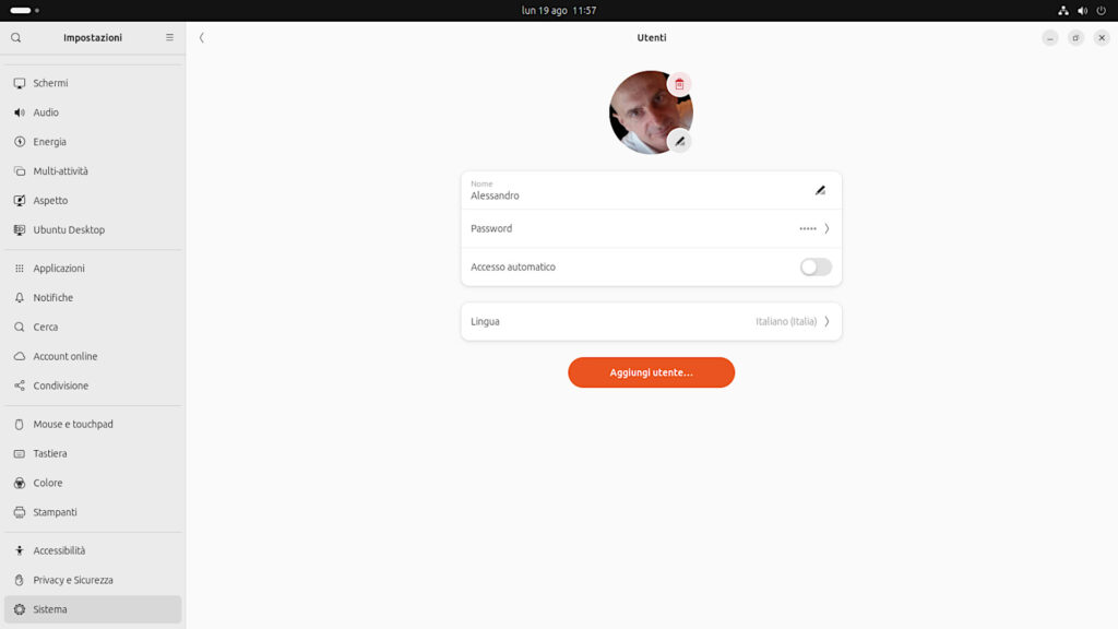 Nella stragrande maggioranza dei casi il login è unico e si riferisce al nostro account utente personale ma possono essere anche di più. Ad esempio, in un sistema casalingo potrebbe esserci un login specifico per ogni familiare che usa il pc. In ogni caso oltre alla scelta del login/utente e della relativa password per poter accedere all’ambiente desktop GNOME, viene mostrata anche un area a icona con la possibilità di inserirci una immagine, come la propria foto o qualsiasi si voglia.