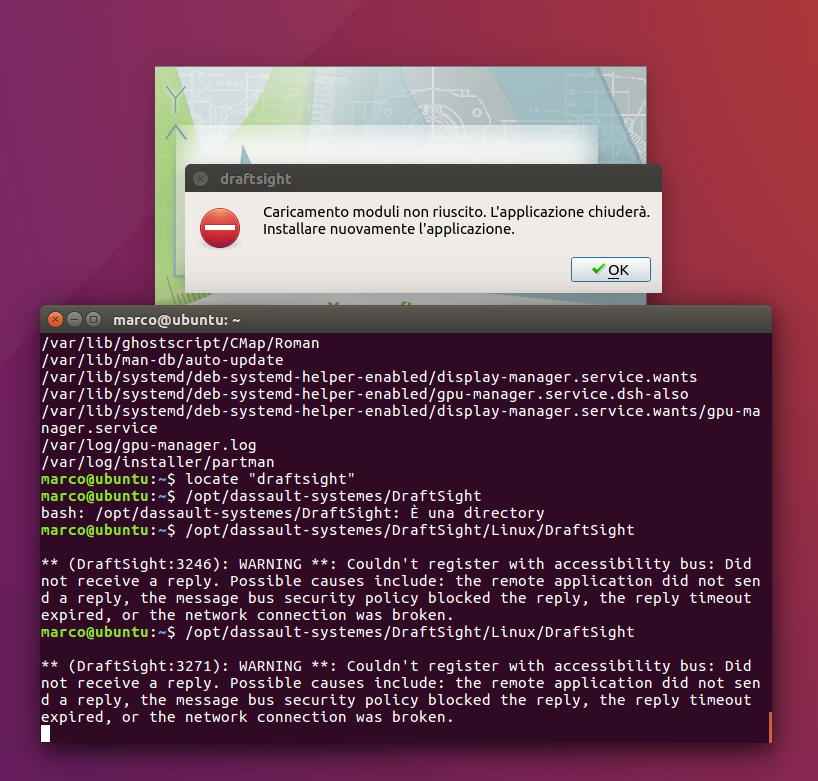 DraftSight e Ubuntu 16.04 LTS: risolvere l’errore “Caricamento moduli non riuscito. L’applicazione chiuderà. Installare nuovamente l’applicazione”
