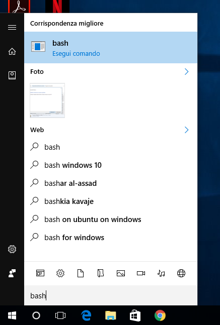 Una volta riavviato il PC dal menu start cerchiamo Bash e lanciamo la Bash di Ubuntu.