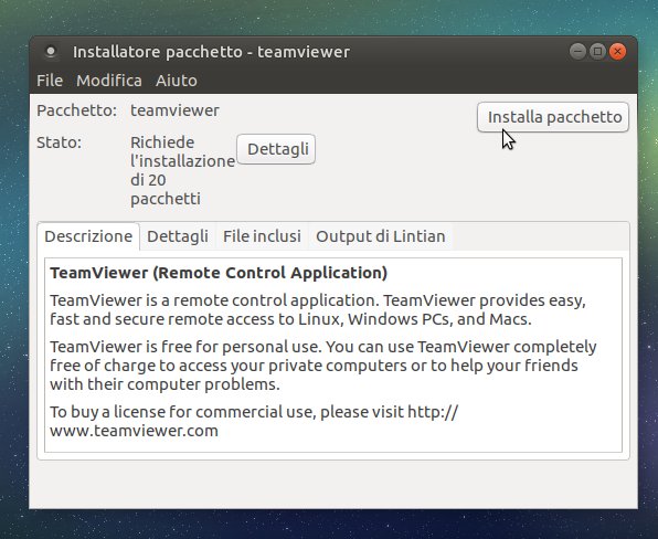 Una volta fatto procedete all’installazione di teamviewer_11.0.57095_i386.deb e tutto andrà per il verso giusto.