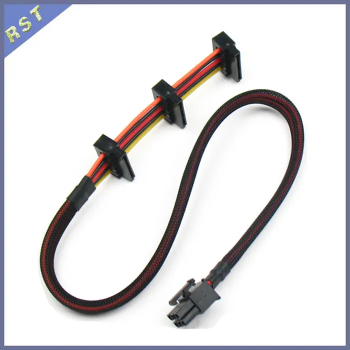 Anche i dispositivi SATA necessitano di corrente dall’alimentatore. Utilizziamo i cavetti d’alimentazione SATA (di solito un lungo cavo con 2 o 3 connettori corrente SATA in serie) forniti con il nostro alimentatore. Se l’alimentatore non è modulare saranno fissi, se è modulare questi cavi possono essere collegati all’alimentatore con attacco a 6pin.