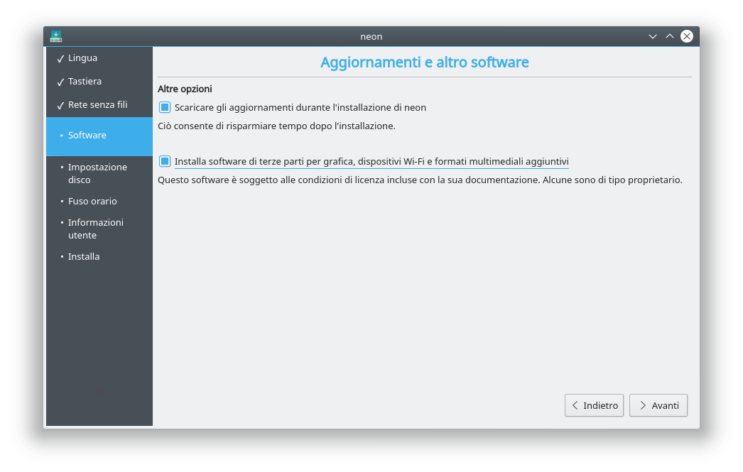 Durante l’installazione di KDE neon è possibile spuntare la voce “Installa software di terze parti per grafica, dispositivi Wi-Fi e formati multimediali aggiuntivi”