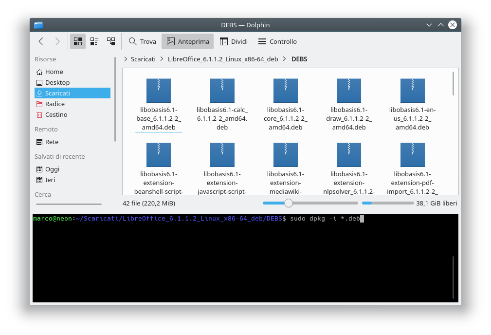 Installare LibreOffice da DEB è semplicissimo, vi basterà scompattare la cartella con i DEB di LibreOffice, spostarci al suo intero tramite Dolphin e premere il tasto F4 sulla tastiera. Così facendo Dolphin vi aprirà una finestra di terminale e vi posizionerà direttamente nella cartella visualizzata in Dolphin