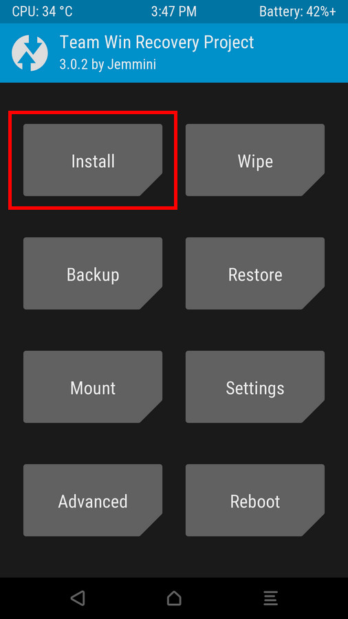 - quindi fate lo stesso di prima: telefono spento, Download, collegate e…fatto! Viene inserita la TWRP e potrete accedervi successivamente tenendo insieme premuti i tasti Accensione e Volume Su (o Volume Giù, uno dei due) fino a quando non appare la recovery (simile a questa):