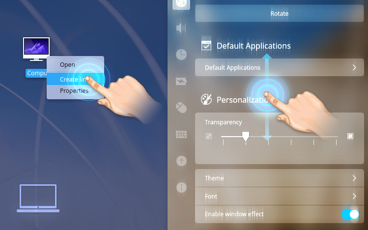 La grossa novità vede il desktop environment (DDE) aggiungere il supporto per le touchscreen gestures ovvero click, doppio click, long press e scroll up/down. Presente anche Onboard, si tratta di una keyboard onscreen che torna molto comoda sia su tablet che su pc.