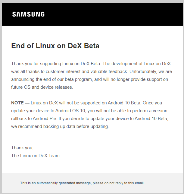 Ho parlato del progetto Linux on Dex svariate volte qui su LFFL ma non pensavo di dare così presto cattive notizie. Dopo soli 11 mesi dall’arrivo della versione Beta, Samsung ha annunciato che Samsung on Dex non verrà aggiornato e reso compatibile con Android 10.