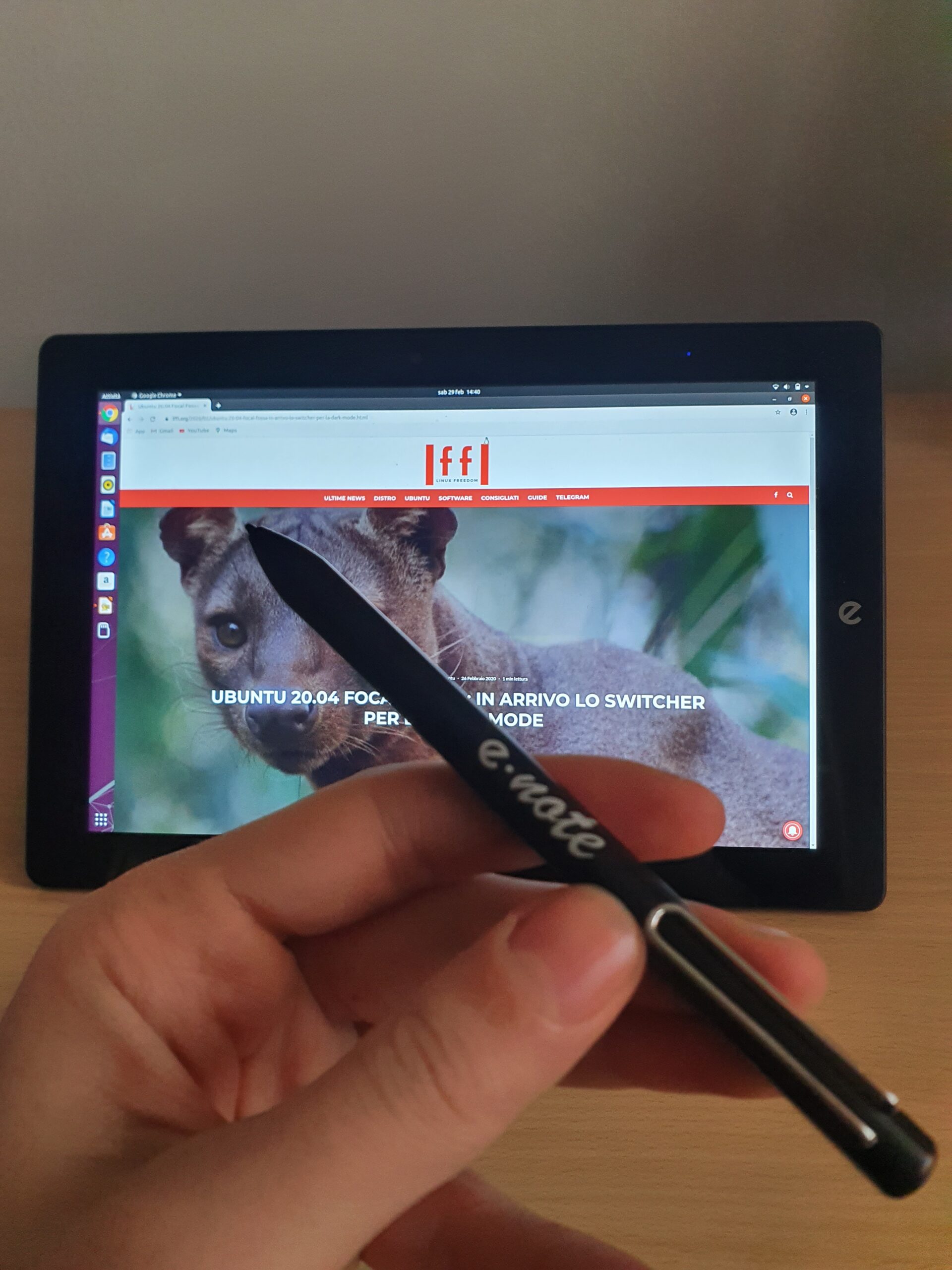 Il giudizio finale è ampiamente positivo: si tratta di un bel prodotto che però, a mio parere, deve essere usato in un determinato modo, soprattutto con Ubuntu. Il sistema operativo non è pensato per essere usato senza mouse e tastiera: le icone sono piccole e il touchpad dell’e-tab Pro non è perfetto. Sicuramente l’e-note aiuta e non poco altrimenti ridurre a icona una finestra o cliccare su un bottone risulta ostico e non immediato. A mio avviso, se si vuole acquistare questo dispositivo, è fondamentale prendere anche il pennino e la tastiera e-keyboard che per quanto piccola (per ovvie esigenze) consente di usare al meglio il tablet. Personalmente ho usato a lungo il tablet con un mouse e una tastiera in modo più che soddisfacente.