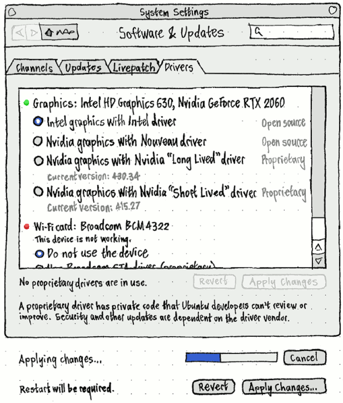 Sarà poi possibile per l’utente scegliere, tramite dei radio button, se utilizzare un driver proprietario, quando disponibile, o open source. Come si evince dal mockup, inoltre, rispetto alla versione attuale del tool, è stato scorporato dal nome del driver il numero di versione, rendendo questa informazione fruibile in maniera molto più semplice.